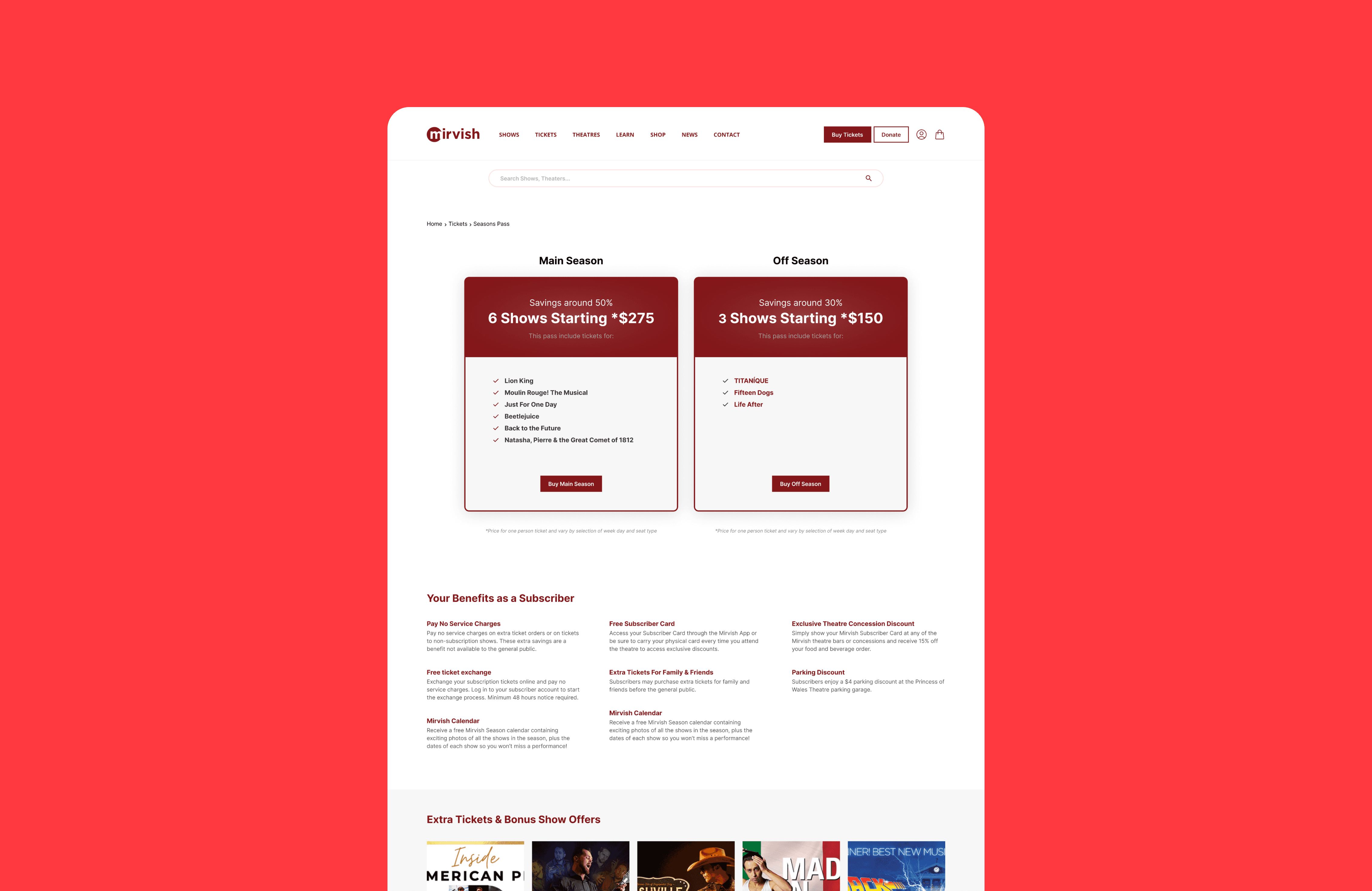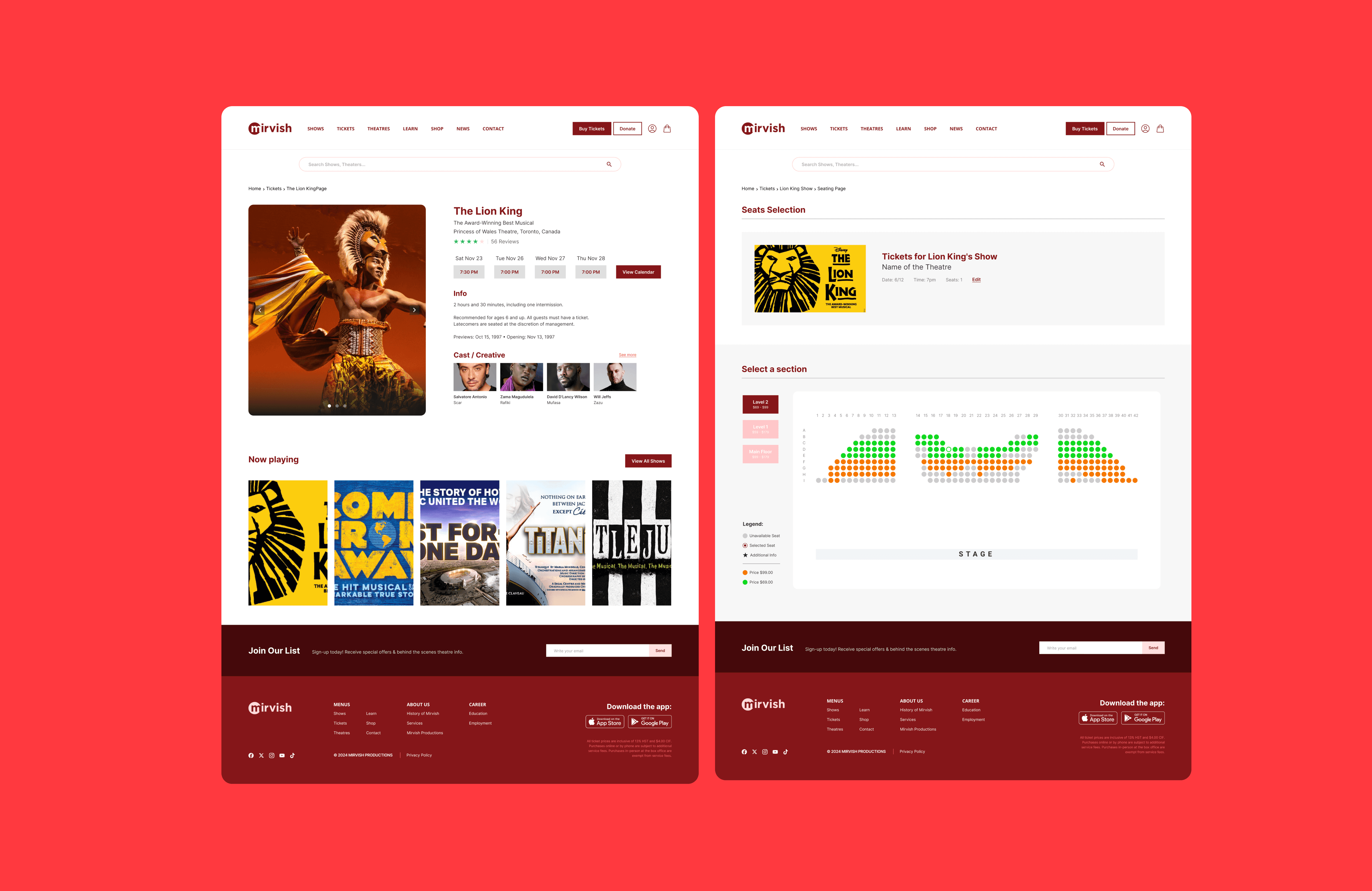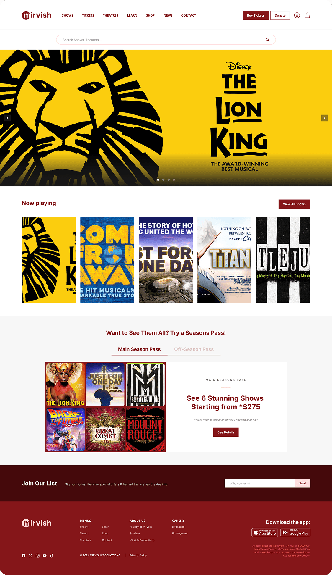 After validating our wireframes and making adjustments based on user feedbacks, we developed a high-fidelity prototype to simulate the final look and feel of the redesigned Mirvish website.